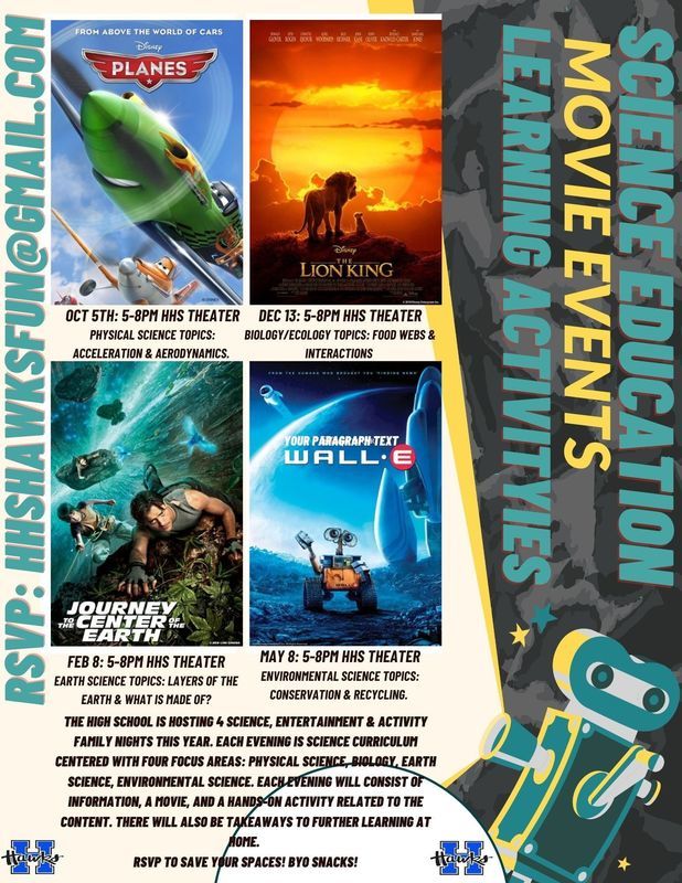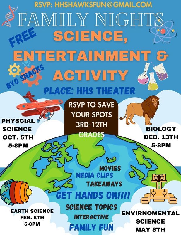 Science, Entertainment & Activity Family Nights: Join the HS Science Team for a night of Science, Movies, and Hands-on Learning! RSVP Now to save your space!