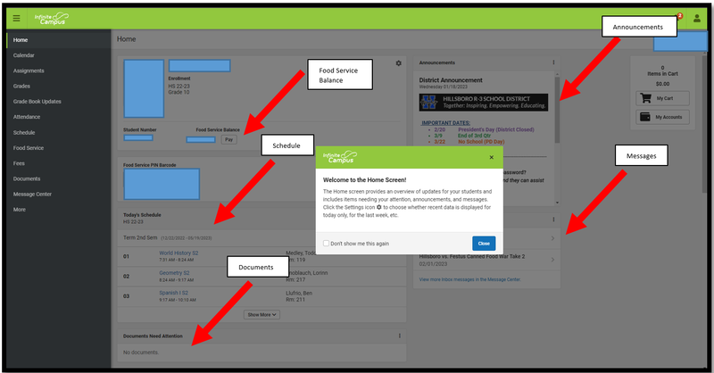 The Infinite Campus Parent Portal has been updated with a new HOME SCREEN that combines multiple pieces of valuable information: